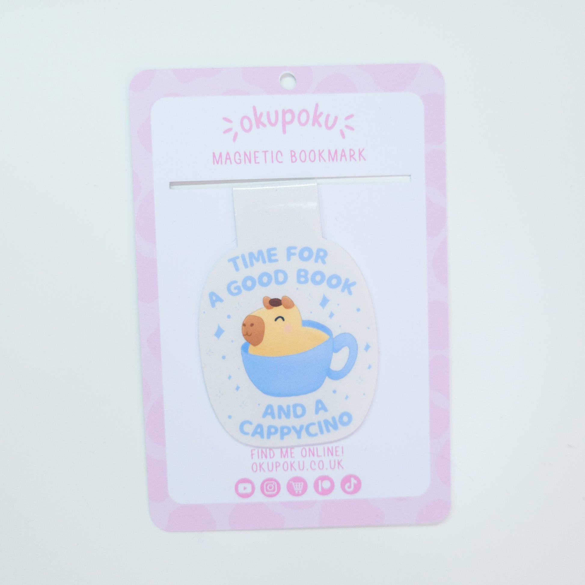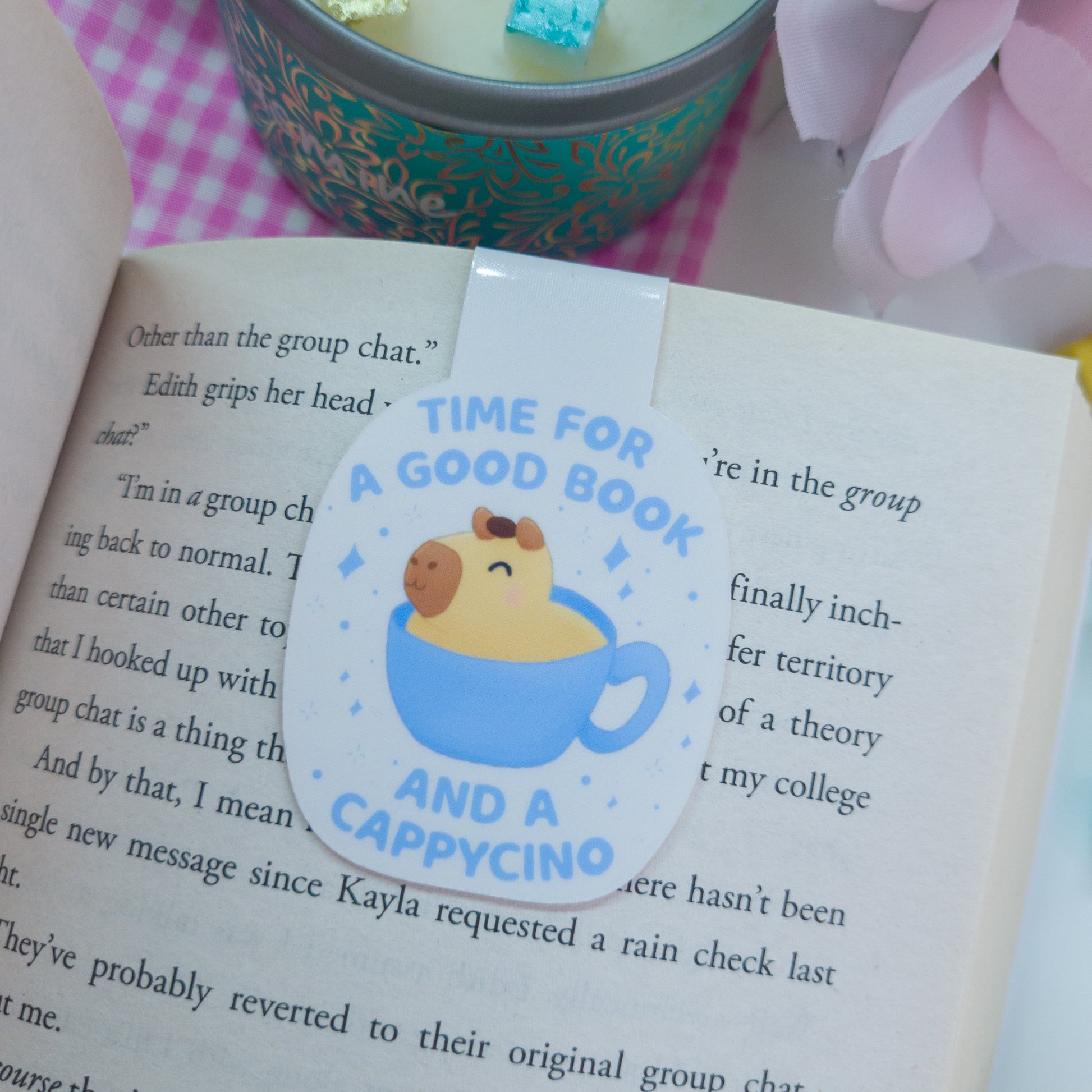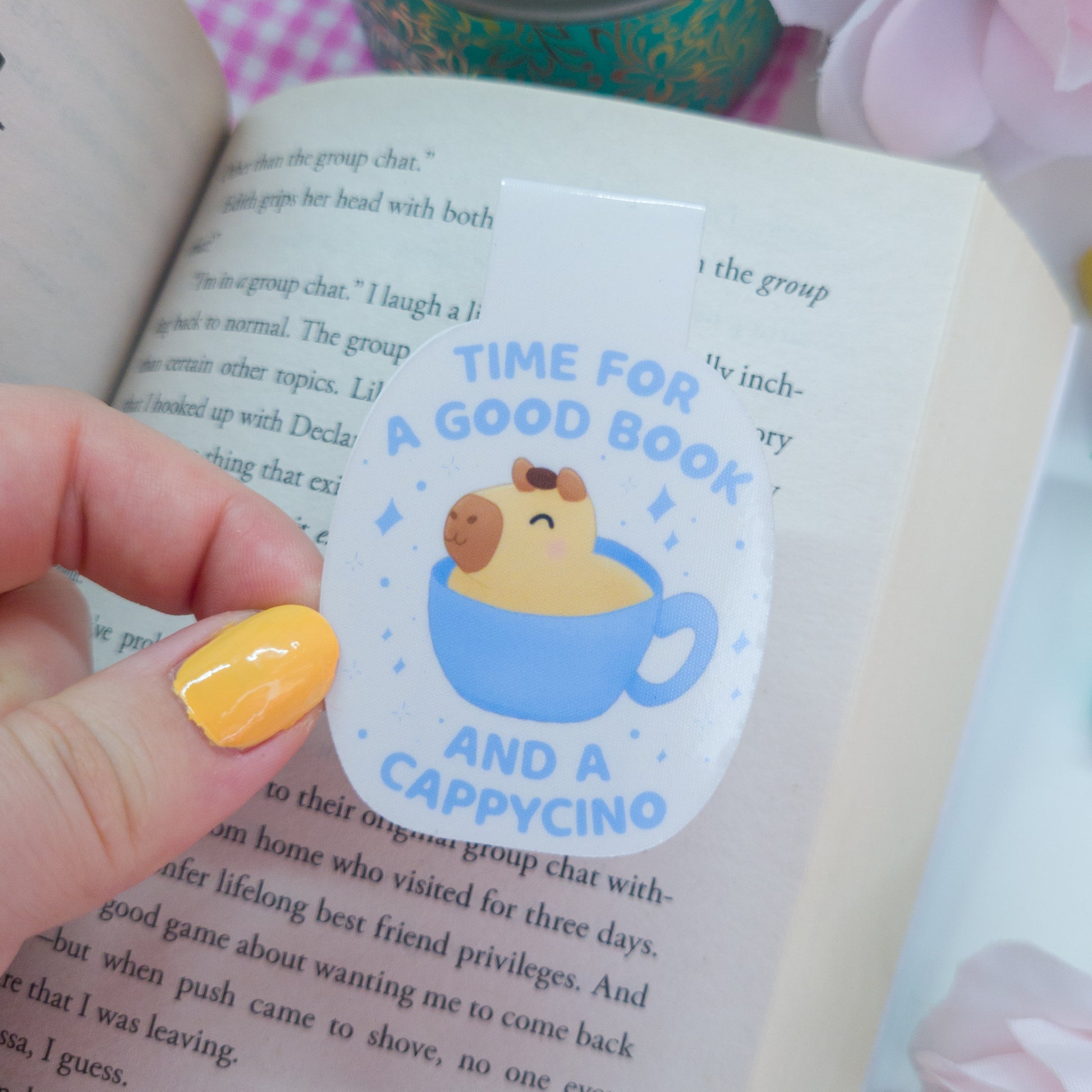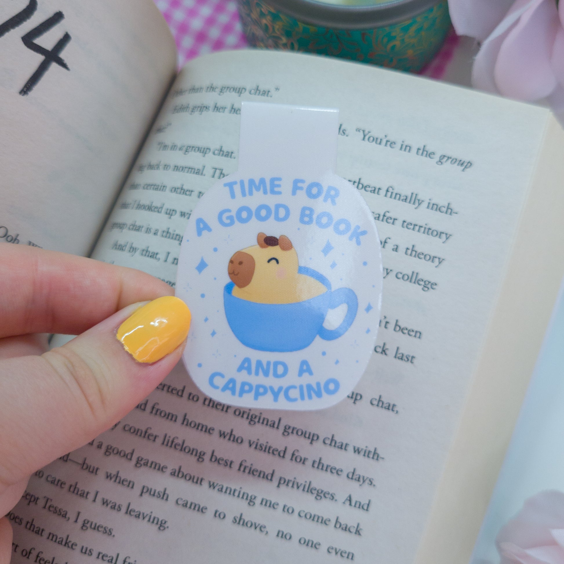 This cute magnetic bookmark design features a silly cappybara sat in a cappucino mug. These bookmarks are made out of high quality cardstock and laminated to provide extra durability, they have magnets that are gentle on your books to avoid wear and tear but strong enough to hold on in there! This design features a cute capycino with the text "Time for a good book and a cappycino"