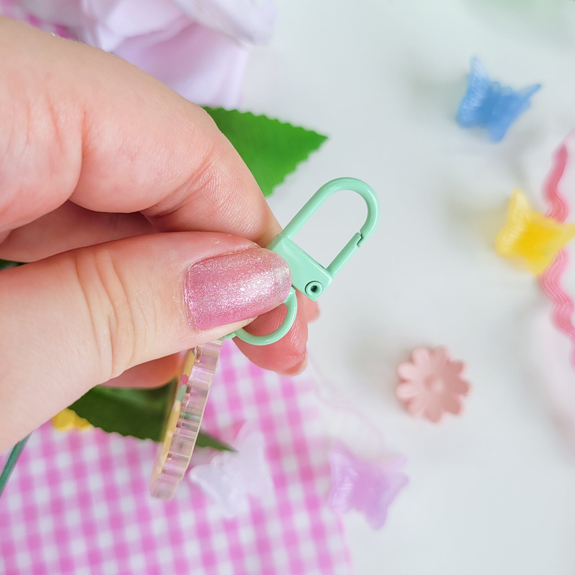 Designed and illustrated by myself, produced by a manufacturer. These charms are made from high quality clear acrylic and are double sided with glitter epoxy on one side, and a coloured keychain/clasp that compliments the design.