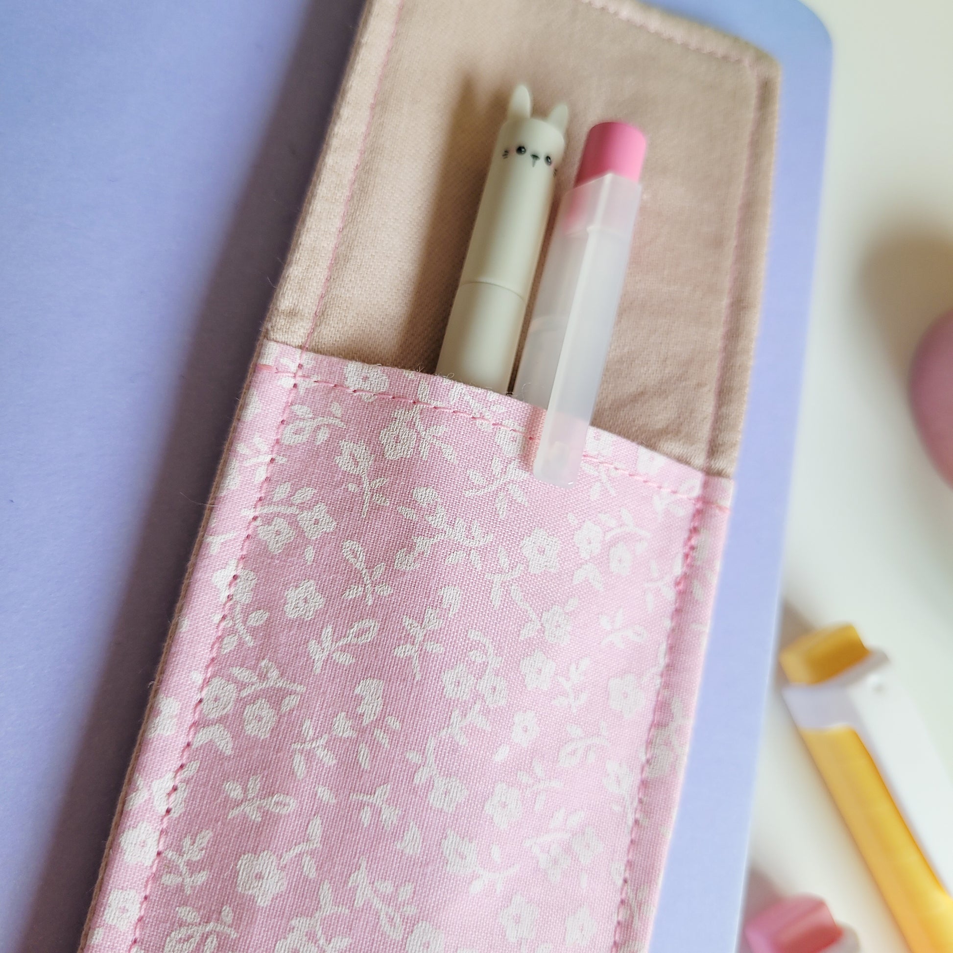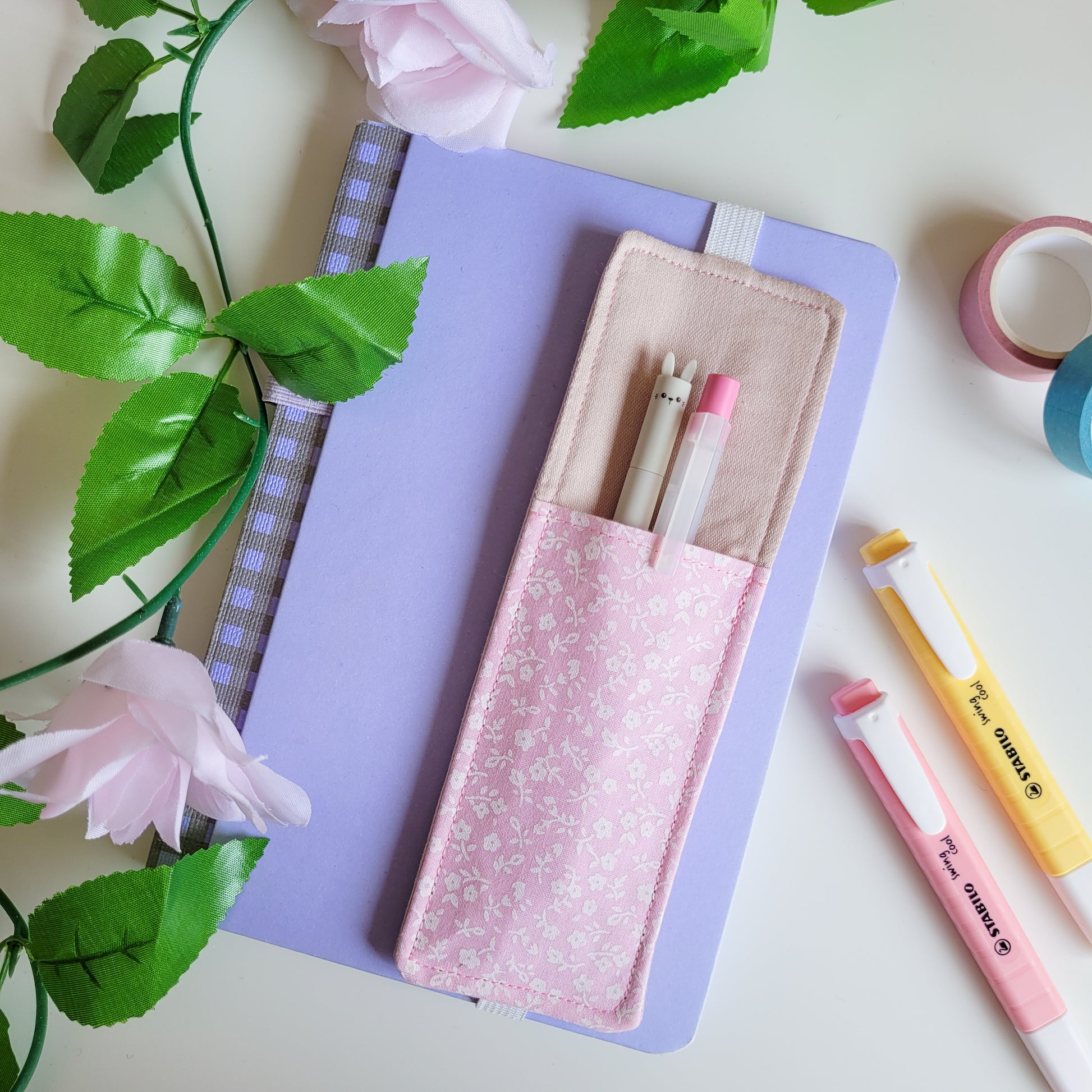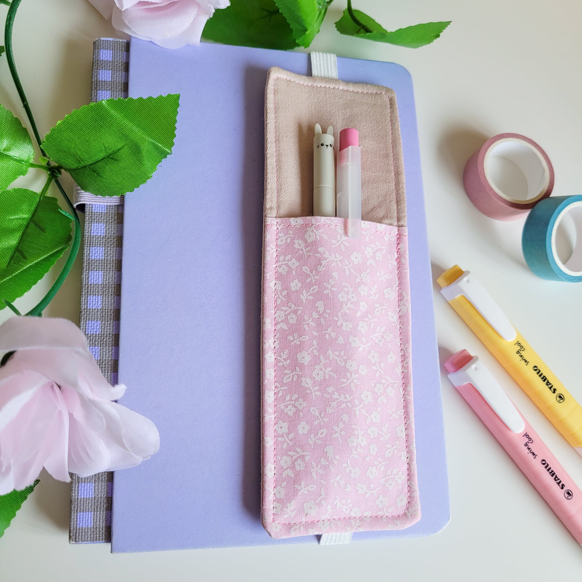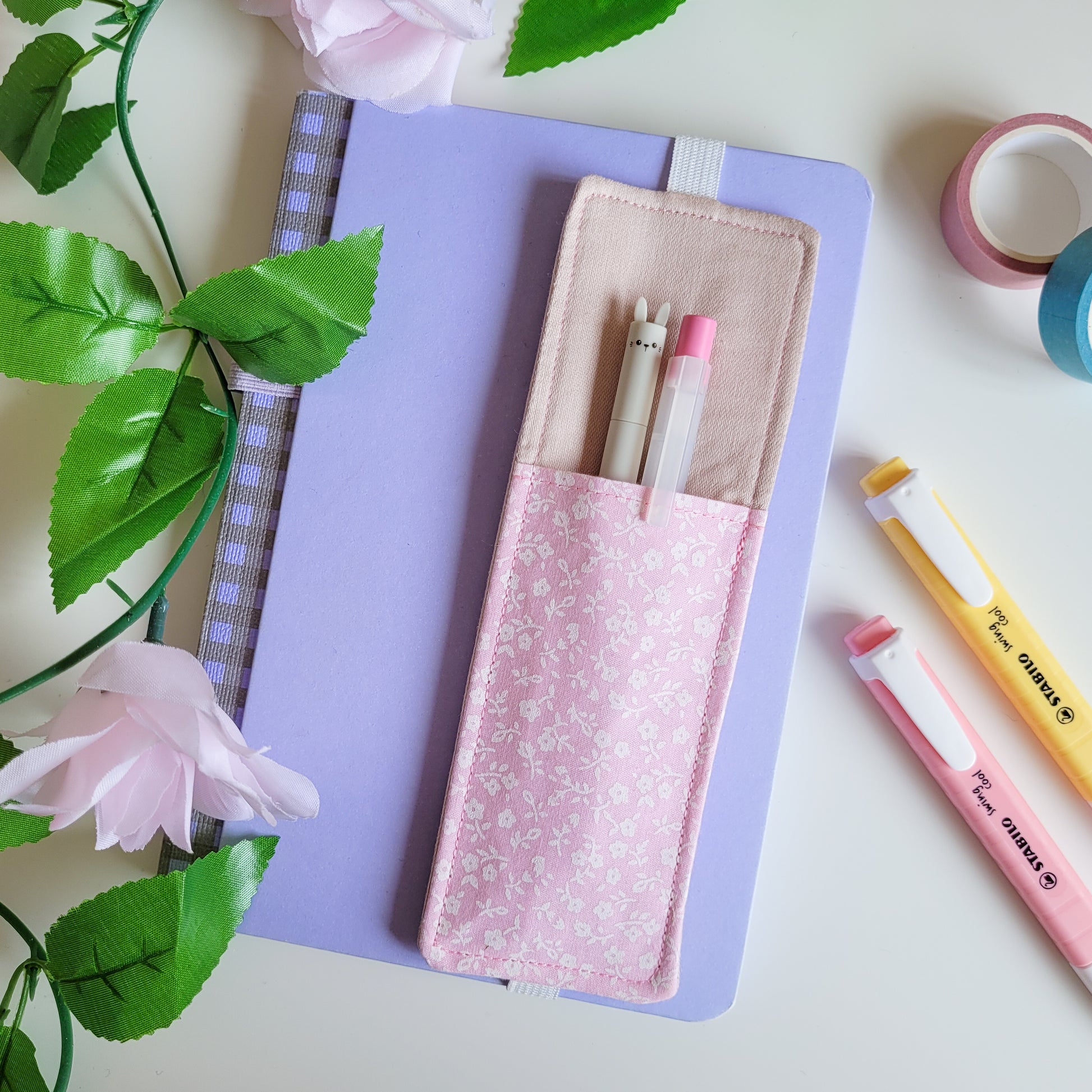 Cute pink flower fabric pen holder elasticated bookmark for planners, journals and notebooks. This is perfect for making sure you don't lose your pens all the time anymore!