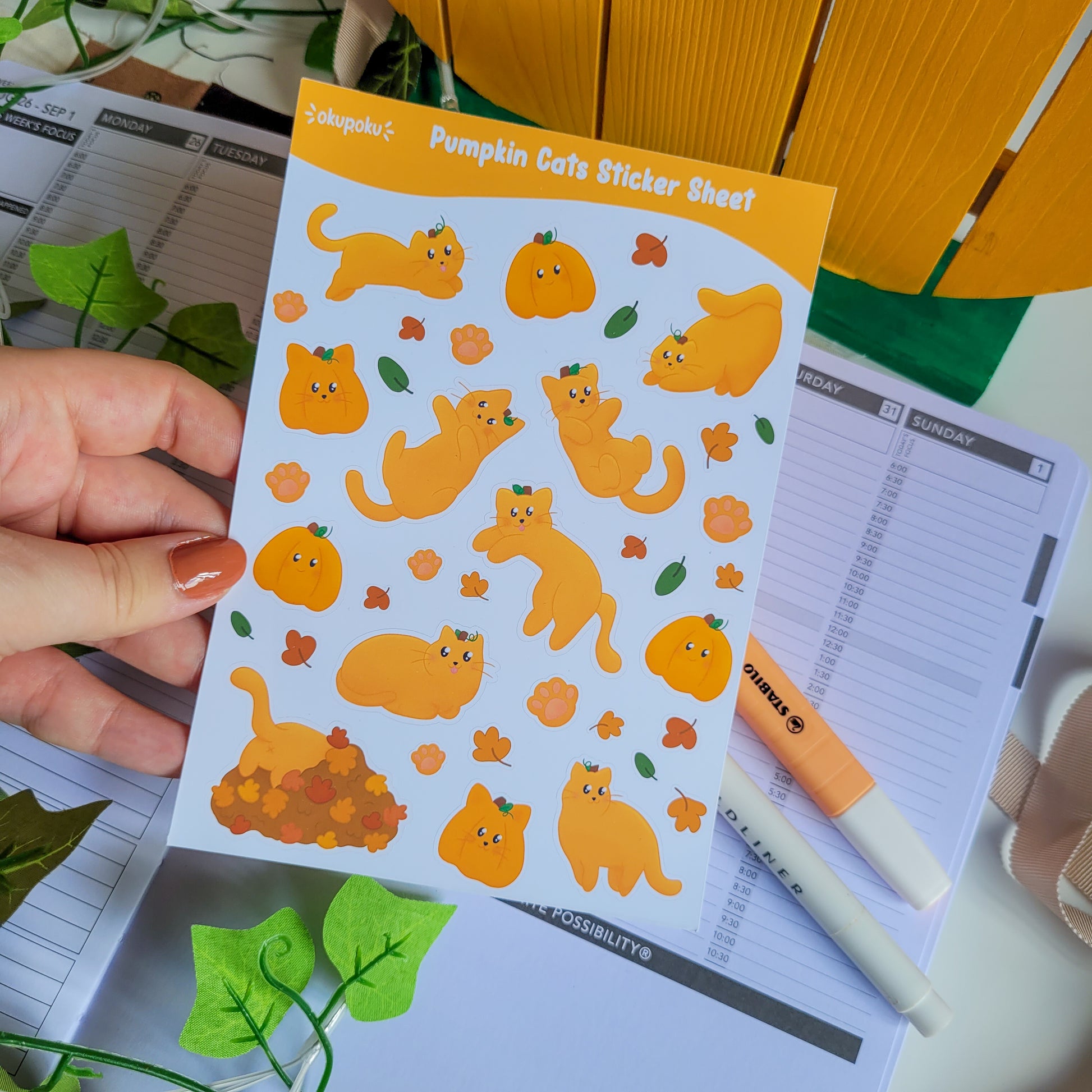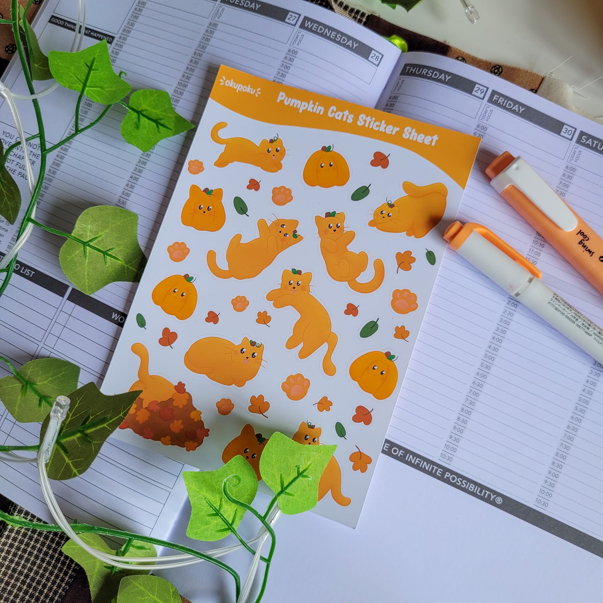 These stickers are perfect for using in your planner and feature 39 stickers! This sticker sheet features lots of cute pumpkin cat illustrations on a sticker sheet great for using in a planner! These cute stickers are kiss cut and easy to peel. These are perfect for using in a planner, on your notebook, or wherever you like!