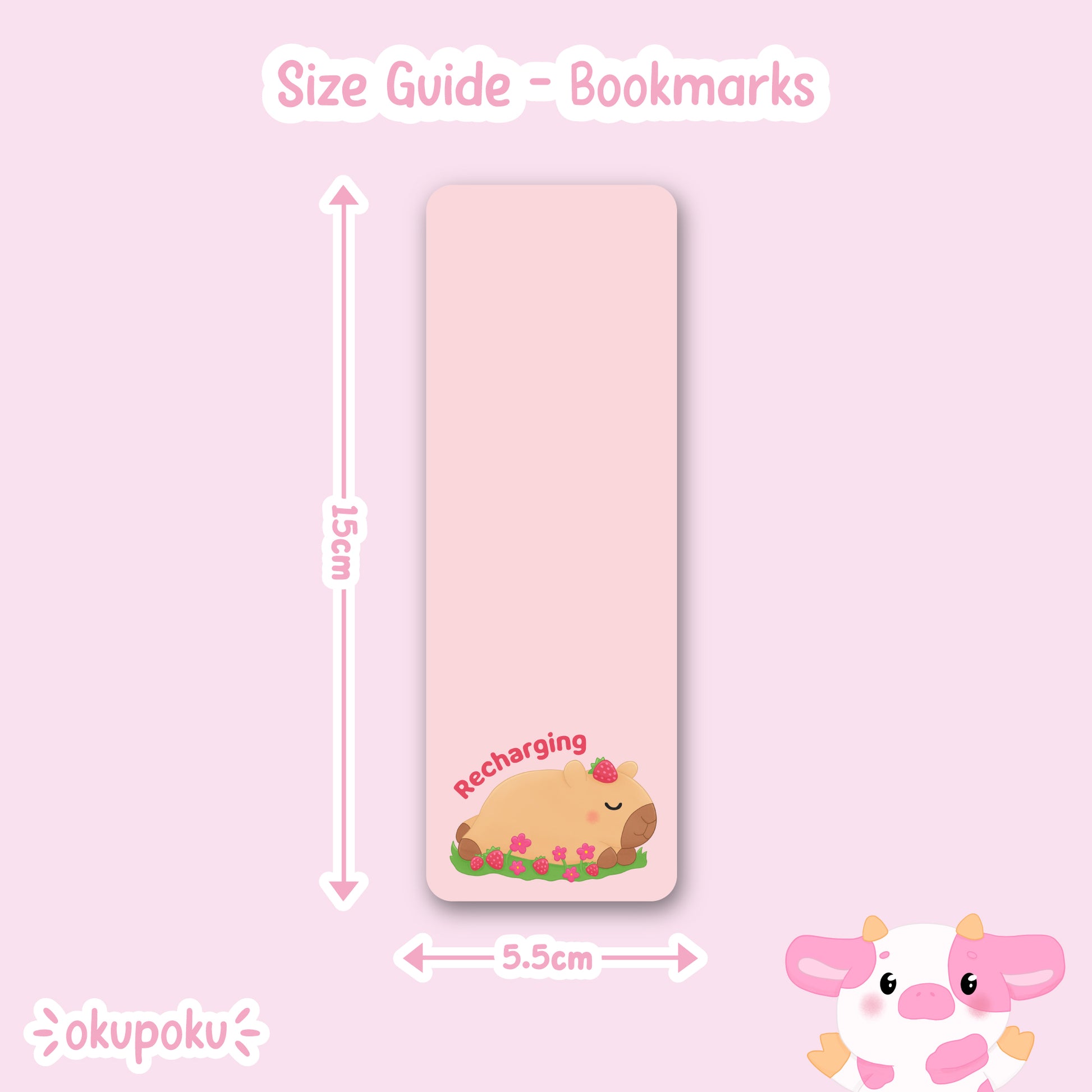 This recharging capybara bookmark would be great for any capybara lover getting comfy with their favourite book! This design a cute capybara with the text "Recharging". These bookmarks are made out of high quality thick cardstock with rounded corners for a softer look.